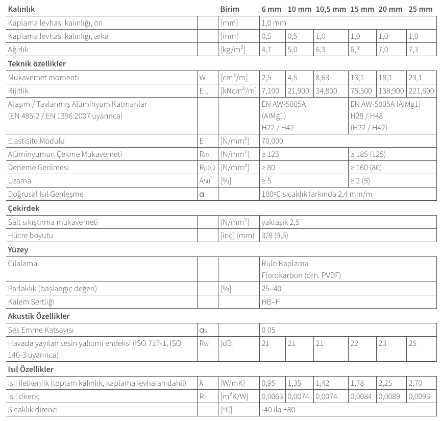 ALUCORE®, hafifliği ve mükemmel derecedeki düzlüğüne ek olarak hava koşullarına çok dayanıklıdır. Yüzey işleme için sadece, hava koşullarına ve endüstriyel kirlenmeye karşı optimum düzeyde dayanıklı, yüksek kaliteli cilalama sistemleri kullanılır.