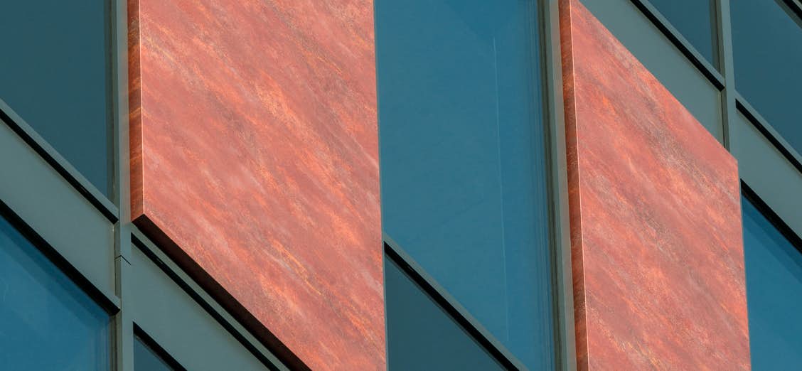 Üzerinde yosun gelişimi olmayan 'ince taneli ve kaba beton', rengi akmayan 'endüstriyel ve paslı metal', korozyon izleri ilerlemeyen 'Patine bakır' ve 'antik pirinç' – ALUCOBOND® vintage mat yüzeyleri ile zamanı geçmişte tutabilirsiniz. Bu malzemeler için tipik olan hava ve yaşlanma süreçleri en estetik anında durdurulur; azaltılmış parlaklık ile yüzeylere özel ve otantik bir antika görünüm kazandırılır.